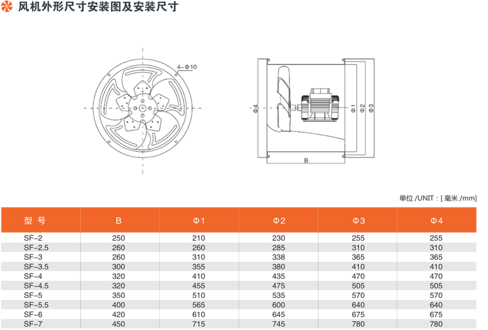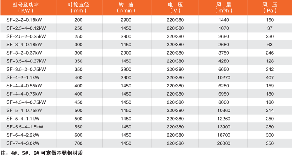 SF型低噪声轴流通风机是本公司在原先的风机基础上,通过风叶和电机重新设计,使其具有噪声低、风量更大、风压高、电机温升低、运行平稳等特点。可以广泛应用于食品、医药、冶金、电站、交通、粮库、烟草等工作场所。本公司严格按照生产防爆电机的要求来生产通风机,绝缘等级达到F级。通过外壳和技术改进,提高了电机的密封性能。因此本产品可以在比较潮湿或温度比较高的环境中使用(温度不能超过60℃ )