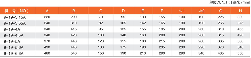 9-19 型高压离心式通风机可以广泛用于输送物料、空气及无腐蚀性不自燃、不含粘性物质的气体。输送的介质温度一般不超过 80℃,所以尘土及硬质颗粒不大于 150mg/m。