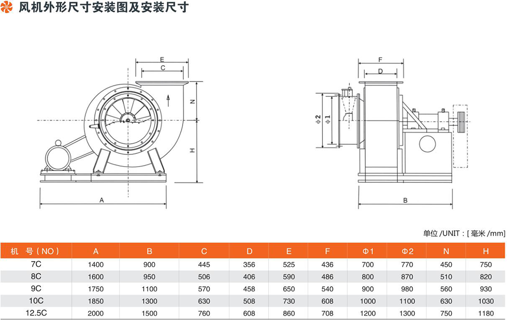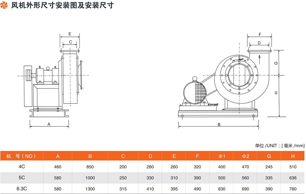 Y5-48型锅炉离心引风机,是为适应燃用各种煤质并配有消烟除尘装置的工业钢炉(1-20吨/小时)而配套设计的。凡进气条件相当,性能又相适应者均可选用,但最高温度不得超过250℃。风机的介质为烟气,Y5-48No.4C~6C气体温度为200 ℃气体密度为0.745kglm°,No.8C-12.5C气体温度为140 ℃;气体密度为0.851kg/m3在引风机前,必须加除尘装置,以保证进入风机的烟气含尘量小于400mg/m3。